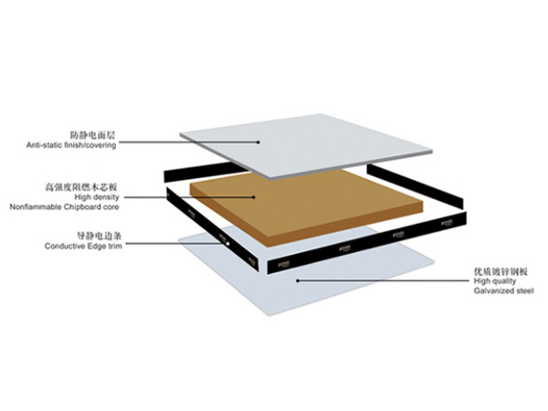 基材采用特制高强度阻燃木芯板,底部粘贴镀锌钢板或铝箔,四边用导静电合成材料密封,表面按需求粘贴防静电陶瓷、大理石等不同面层。此款产品具有高承载力,同时具备隔音、隔振、抗污、耐化学腐蚀等特点,且铺装效果好,易维护,互换性强,使用寿命长。